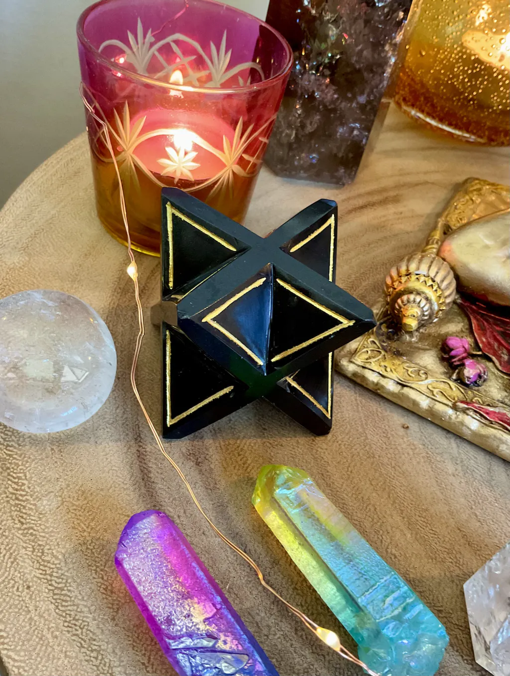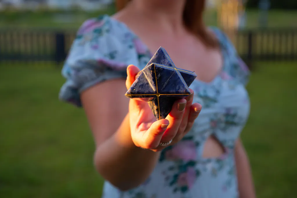 Merkabas can be used as a meditation tool, a vehicle for balancing energy in your aura or space; simply placing the Merkaba in your home as a decorative item will still have a powerful effect. The Merkaba's shape is a combination of two tetrahedra, with one pointing up towards the cosmos, channeling energy down from the heavens, and one pointing downwards, drawing energy up from the earth.